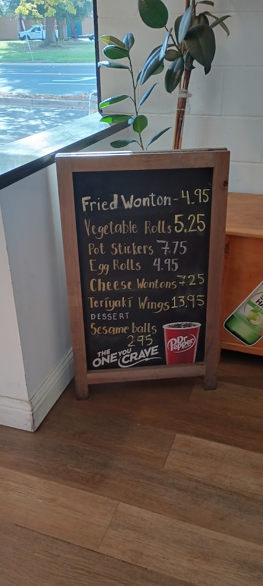 - Appetizers: A selection of starters including Vegetable Rolls, Egg Rolls, Fried Wonton, Cheese Wontons, Sesame Balls, and Teriyaki Wings.