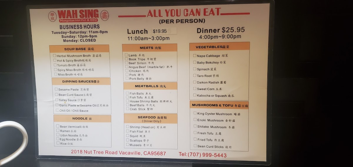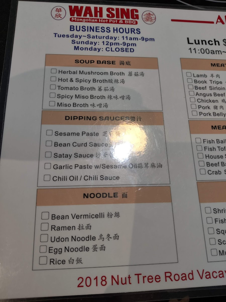 Wah Sing Mongolian BBQ & Hot Pot Menu